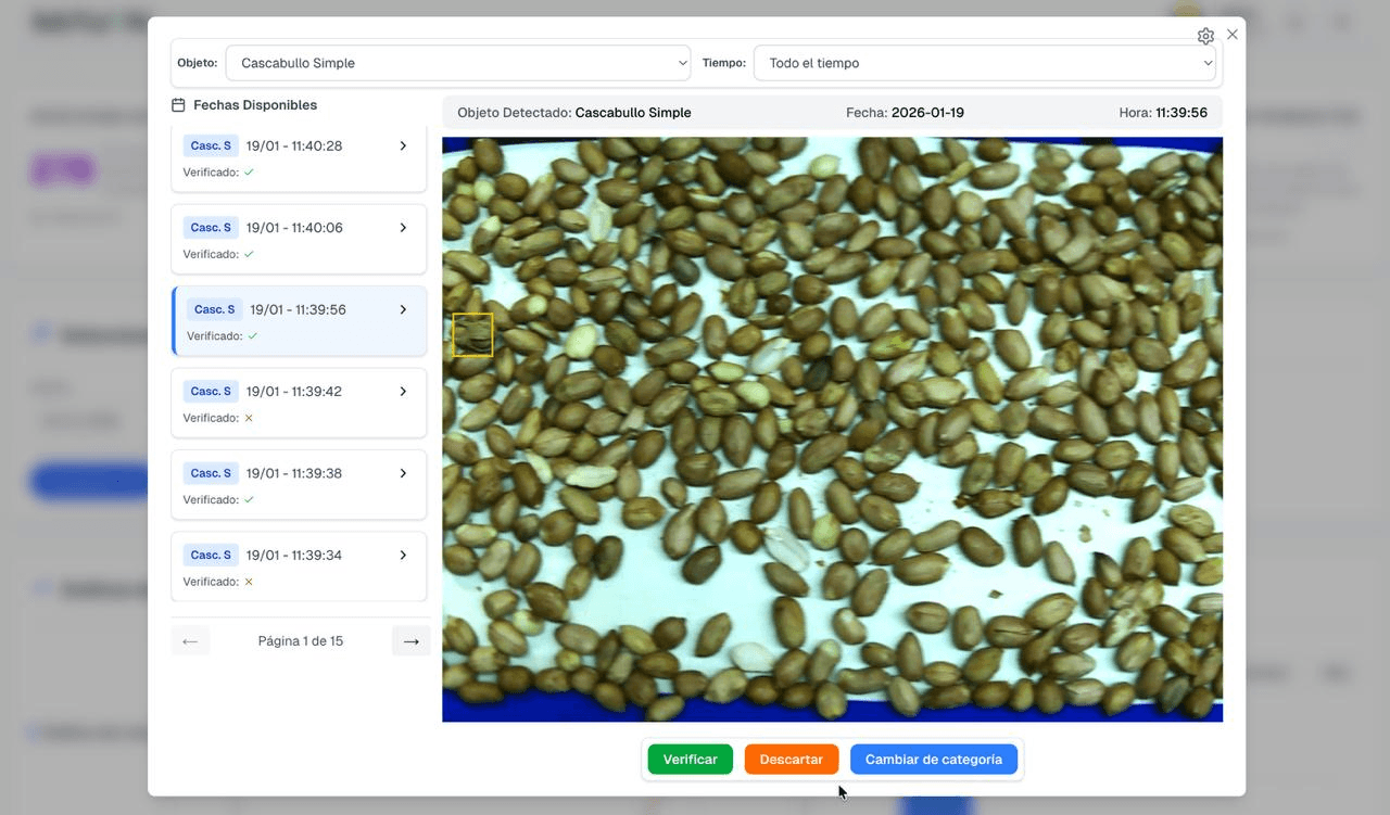 Desarrollamos e implementamos un sistema basado en Computer Vision diseñado específicamente para entornos industriales complejos. La solución monitorea constantemente el flujo de materia prima (maní) para identificar desviaciones de calidad, productos defectuosos o elementos extraños de forma automática.